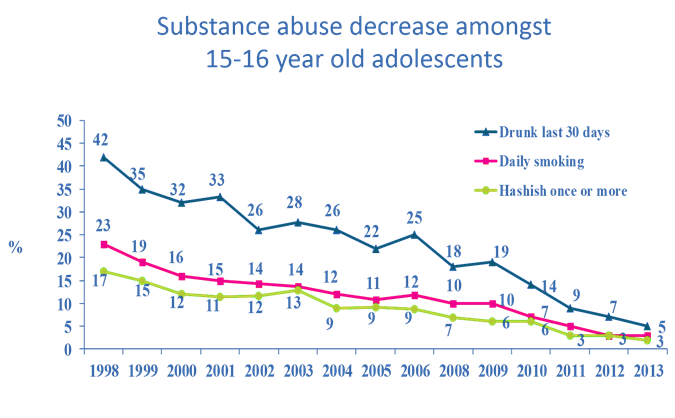 In 1998, 42% of 15 to 16 year old Icelanders had become drunk during the past 30 days whereas now, in 2013, only 5% of students report the same. Daily smoking and the use of cannabis has also decreased dramatically.
