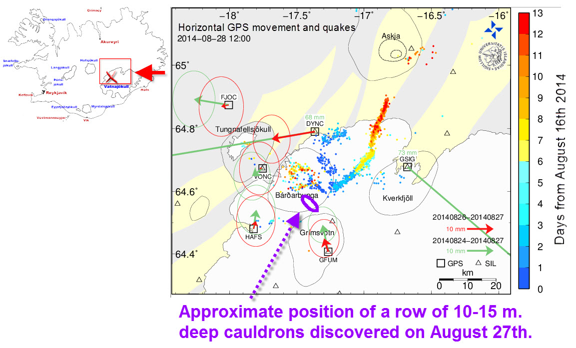 Scientists from the Icelandic Earth Science Institute, the Icelandic Meteorological Office and representatives from the Department of Civil Protection and Emergency Management were on a flight surveilling the surface of Vatnajökull tonight and discovered a row of 10-15 m deep cauldrons, 1 km wide, south of the Bárðarbunga caldera. They form a 6-4 km long line.