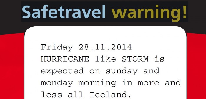 Iceland – Safe travel warning! Friday 28.11.2014 – HURRICANE like STORM is expected on Sunday (30.11) and Monday (01.12) morning in more and less all Iceland. Check www.safetravel.is and/or ask at your accommodation, restaurant or information center.