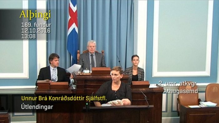 Unnur Bra Konradsdottir congresswoman for the Icelandic independent party brought her newborn baby daughter with her to work today. This is considered normal practice for working mothers in Iceland, its unusual however, for an MP to breastfeed while participating in a debate in parliament. Today the discussion and vote revolved around a new legislation on foreign nationals in Iceland. While the debate generated some fiery discussions among present parties, the baby girl didn’t stir under the debate but remained calm on her mother´s arm. They baby was born to Konradsdottir and her husband on the first of September and has two older siblings.