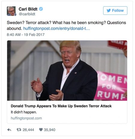 However nothing happened in Sweden, there was no attack, nothing took place out of the ordinary. The Swedish embassy in Washington has demanded explanations of the remark and social media in Sweden has been on fire, blasting the president for inciting fear of terror and fear of asylum seekers with made up stories. Former Foreign Minister Carl Bildt tweeted the following:
