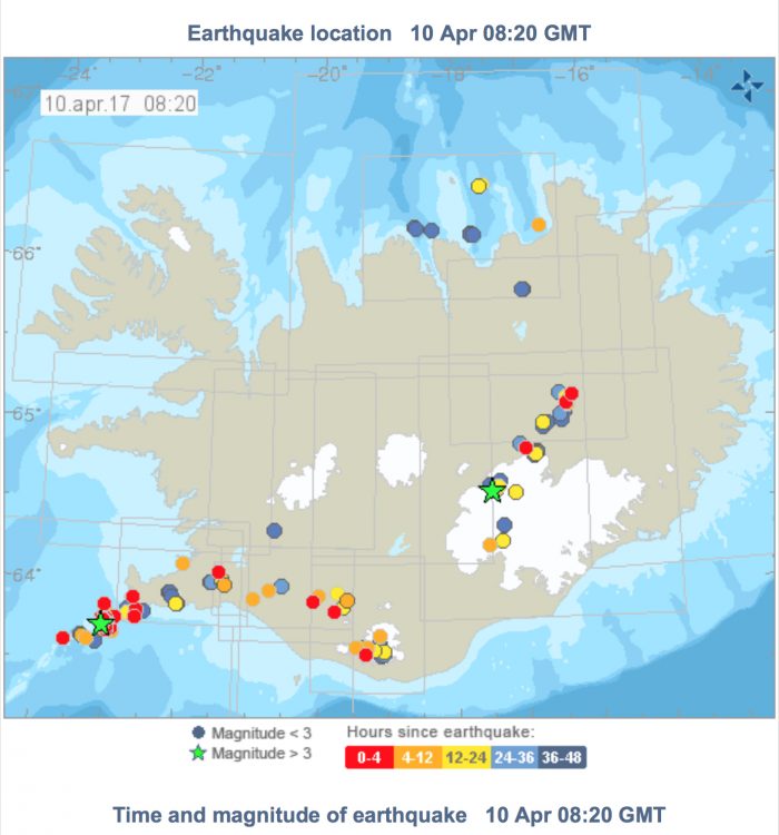 An earthquake magnitude 4.5 rocked the south west of Iceland this morning at 3.40 am. The origin of the earthquake was 119 kilometres west southwest of the tip of the Reykjanes peninsula, called Reyjanestá, approximately 11 kilometres under sea level. Two large tremors of magnitude 2.7 tailed the earthquake a few minutes later, followed by a chain of smaller tremors. Over a hundred small temmers were measured by 6.30 am, all under or around magnitude 2.0 There are no reports about the earthquake’s effect on human habitat.