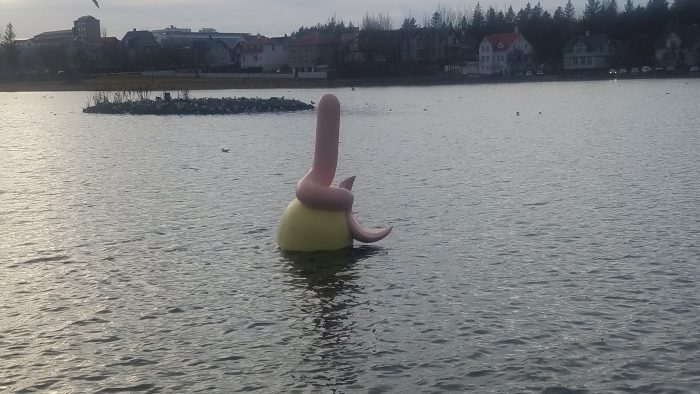 Locals and tourists in Reykjavik found a little surprise when walking around Tjörnin (the city centre pond) after Friday night. As part of the Cycle Music and Art Festival, an art piece, ‘Hafpulsan’ by Steinunn Gunnslaudóttir, which has certain phallic resemblances, has temporarily been installed to commemorate Iceland’s 100th year as a sovereign nation.